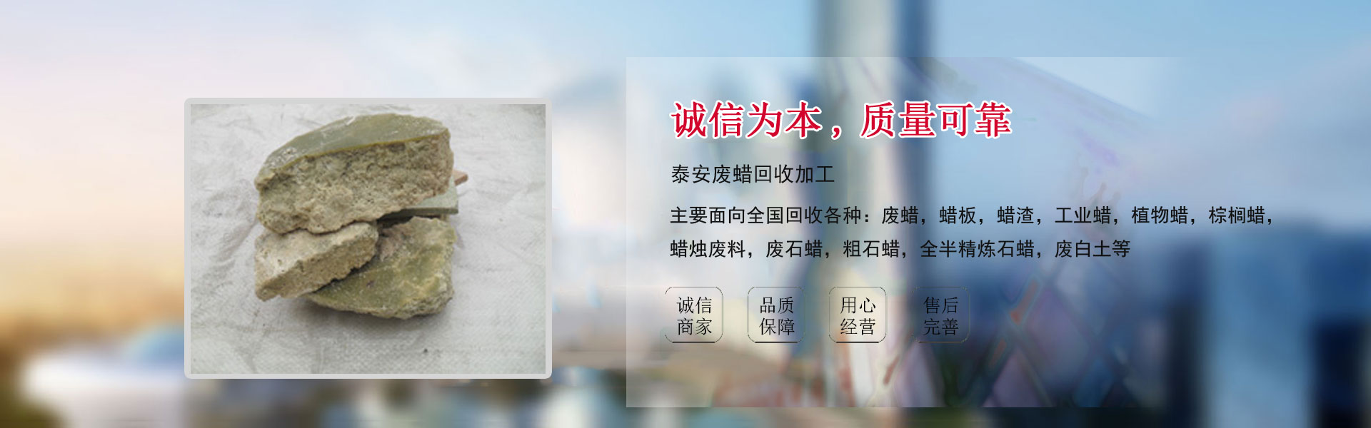 泰安废蜡回收加工13953849175主要业务有:废蜡回收,废石蜡回收。坐落在泰山脚下,南邻孔子地曲阜;西靠水浒一百单八将驻地梁山;东接京沪高铁、京福高速、104国道。 文化底蕴丰厚,地理环境优越,交通运输便利。从事各种废蜡收购的厂家,业务遍及全国二十多个省市和地区,深受新老用户的一致好评。主要面向全国回收各种:废蜡,蜡板,蜡渣,工业蜡,植物蜡,棕榈蜡,蜡烛废料,废石蜡,粗石蜡,全半精炼石蜡,废白土等。山东/河南/河北/江苏各市县业务均可上门洽谈,小量大量均可。